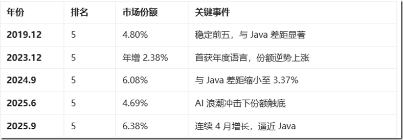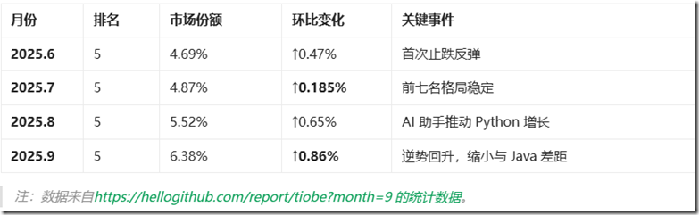 C# 2025年6-9月TIOBE排名增长及未来展望