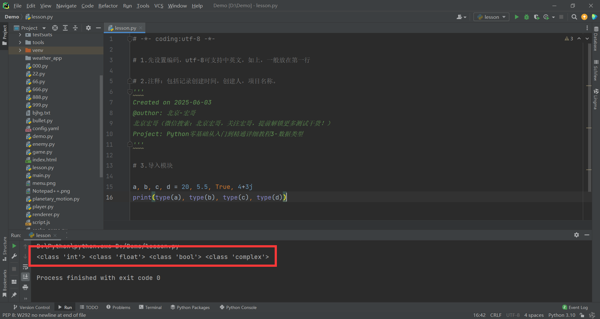 1.简介 上一篇宏哥讲解和分享了Python的变量和常量,今天宏哥按照计划讲解和分享一下Python的基本数据类型。我们先来看一下学习变量和基本数据类型的目的。Python是一种高级编程语言,它支持多种数据类型,用于存储和操作不同类型的数据 ...