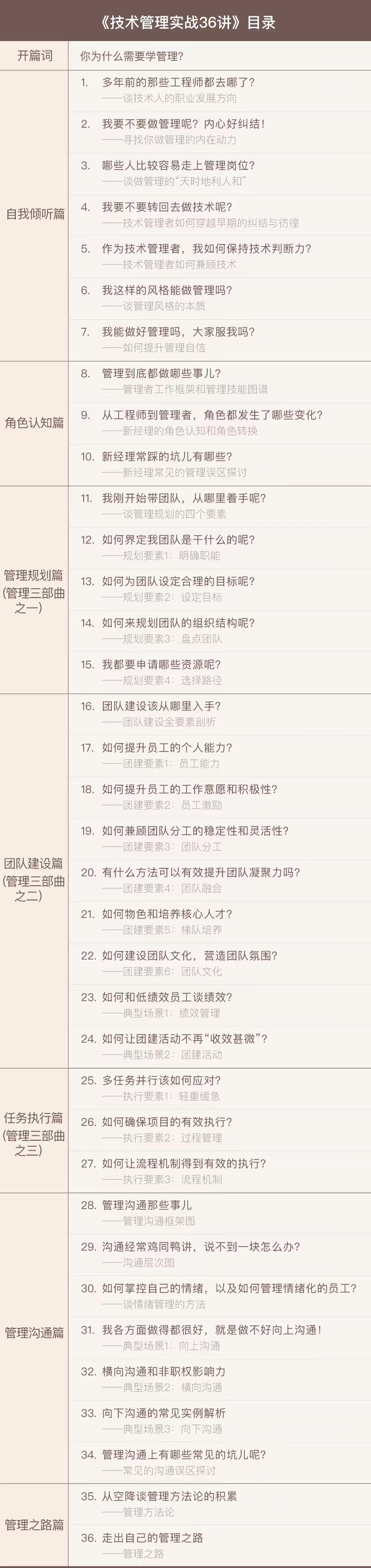 前言 对于互联网技术人来说,“带团队”不再是一个可选项,而是迟早都要面对的事儿。做技术和带团队,更像是职业发展的两条腿,而不是完全叉开的两条路。 ----- 摘自技术管理实战36讲 刘建国老师,将多年的技术管理经验浓缩于此课程, ...