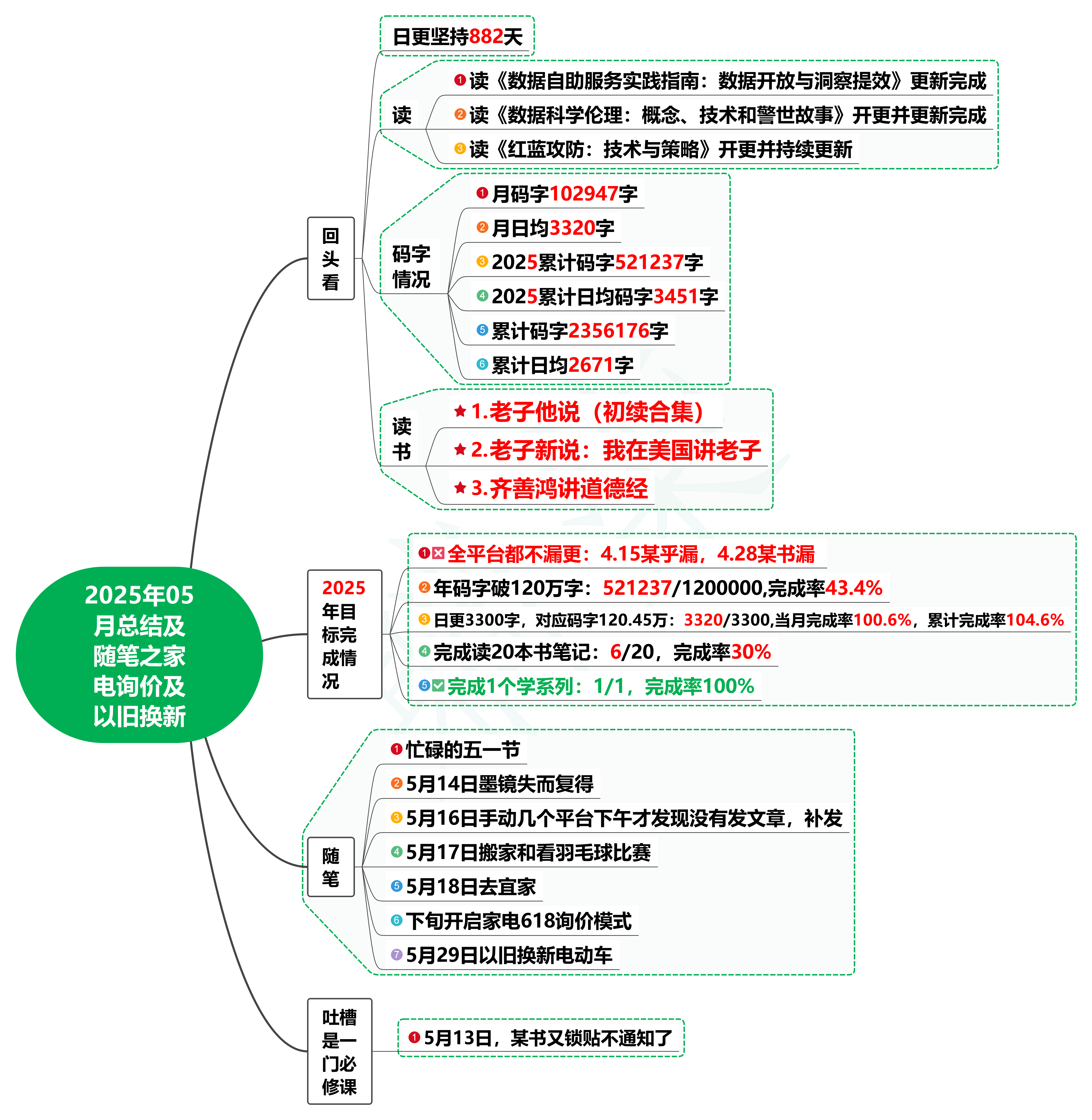 1. 回头看 日更坚持了882天。 [*]读《数据自助服务实践指南:数据开放与洞察提效》更新完成 [*]读《数据科学伦理:概念、技术和警世故事》开更并更新完成 [*]读《红蓝攻防:技术与策略》开更并持续更新 2023年至2025年05月底累计码字 ...