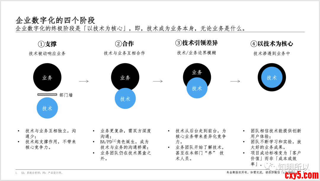 衡量企业的数字化程度有很多角度,从技术团队与业务团队的融合度角度,我们可以把企业的数字化程度分为4个阶段: 数字化转型的终极目标是实现「以技术为核心」,即,技术成为业务本身,无论业务是什么。 下面四个阶段详述,您可根据以下 ...