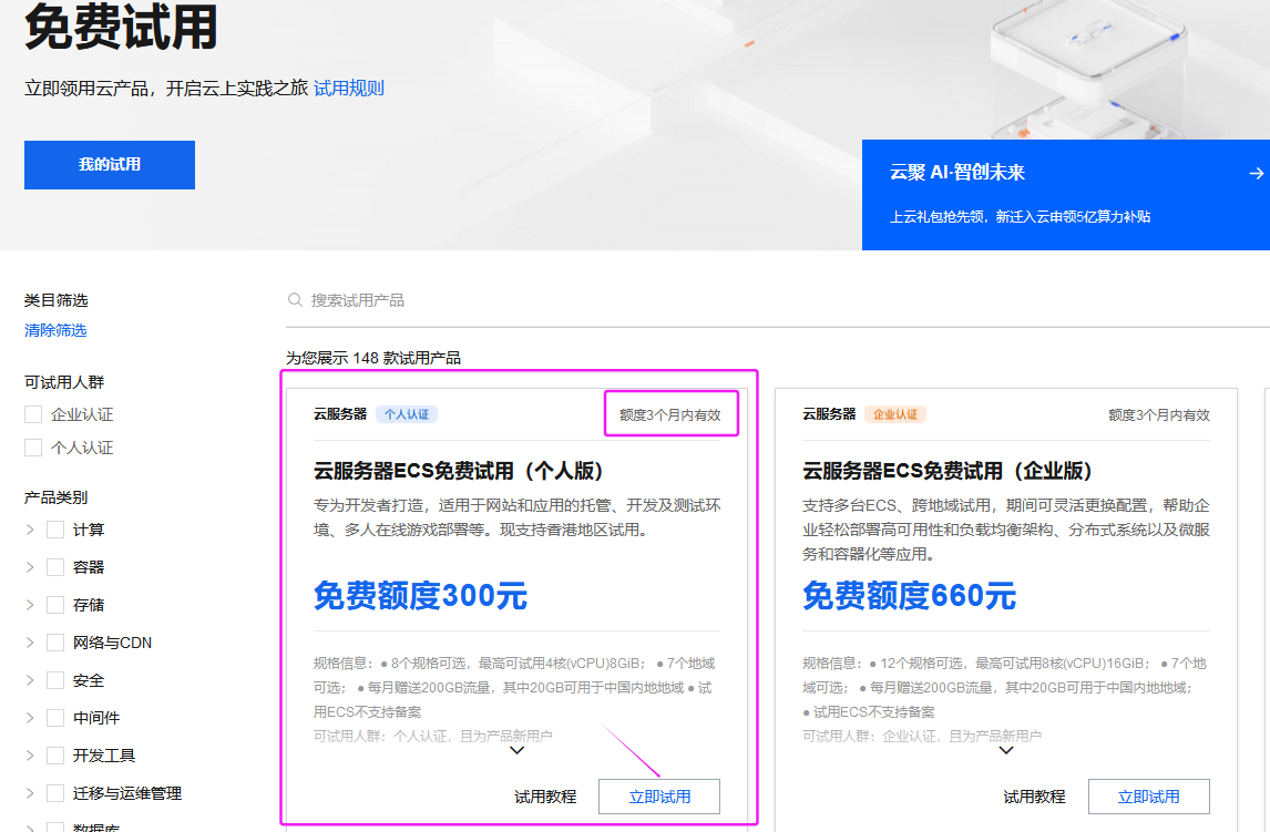 3、在免费试用专区 -- 选择云服务器。新人享有免费试用3个月的额度。这里看自己情况选择个人认证还是企业认证。个人认证主要是身份证实名认证;企业认证需要相关企业信息;如果是自己使用,选个人认证。