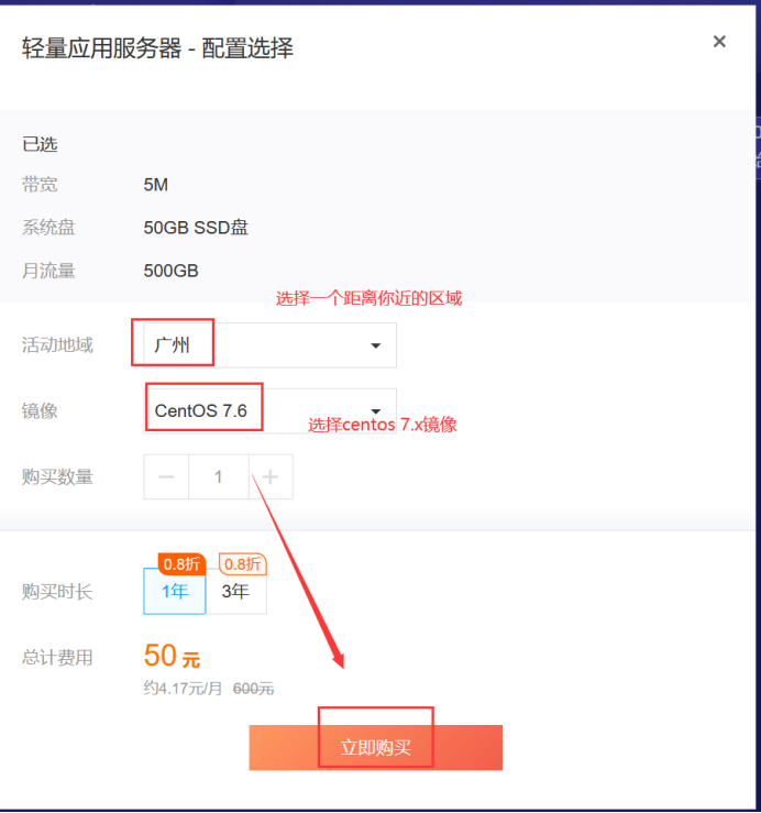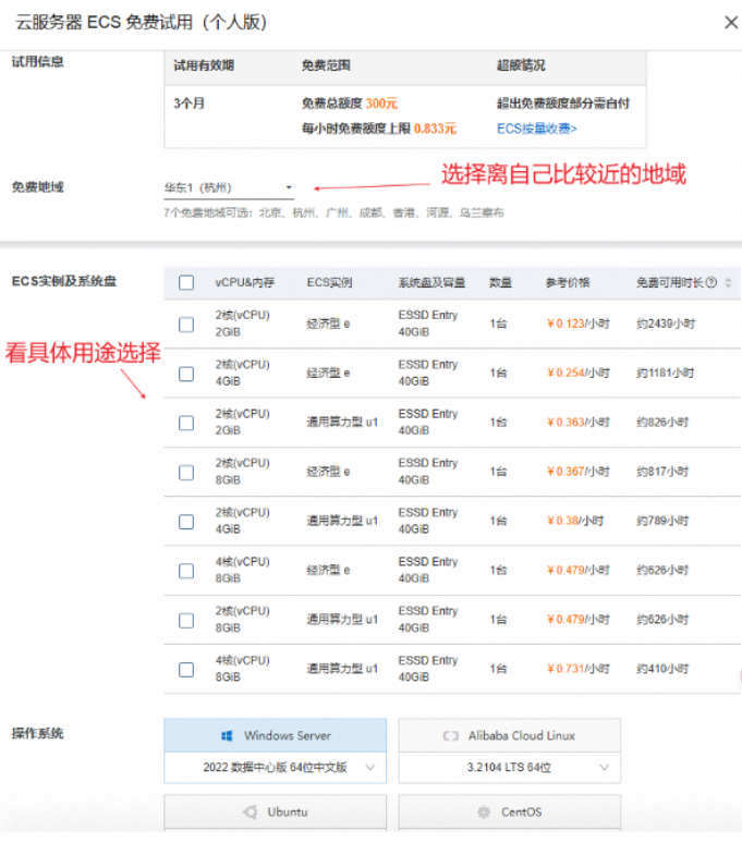 4、点击立即试用,未登录需先登录,可支付宝扫码登录,然后进行如下图服务器的配置选择。例如操作系统选择centos7.版本,选好后,点立即试用。然后一路依据操作提示,完成服务器试用操作。包括支付、实名认证。