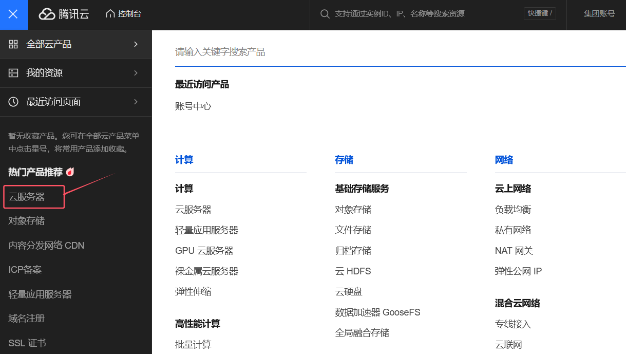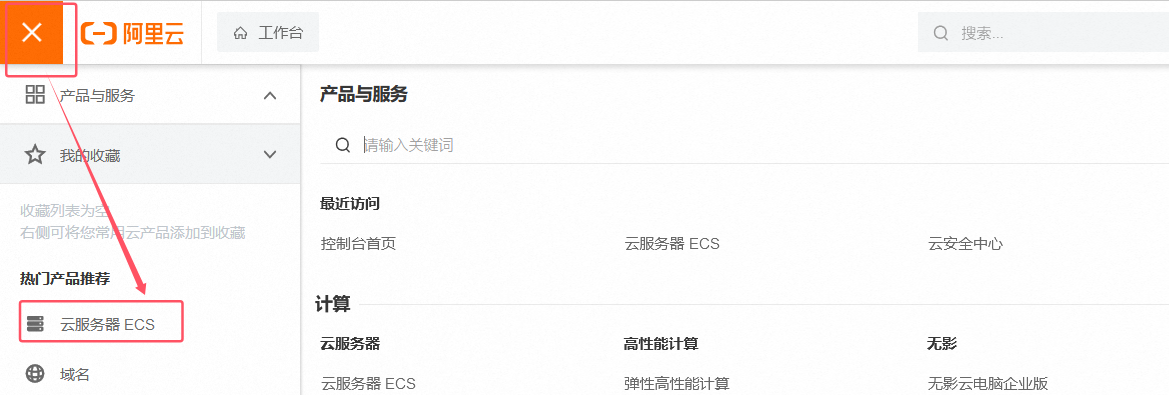 5、完成后,会到阿里云首页,点击控制台--左上角 - 点击云服务器ECS,查看自己的云服务器