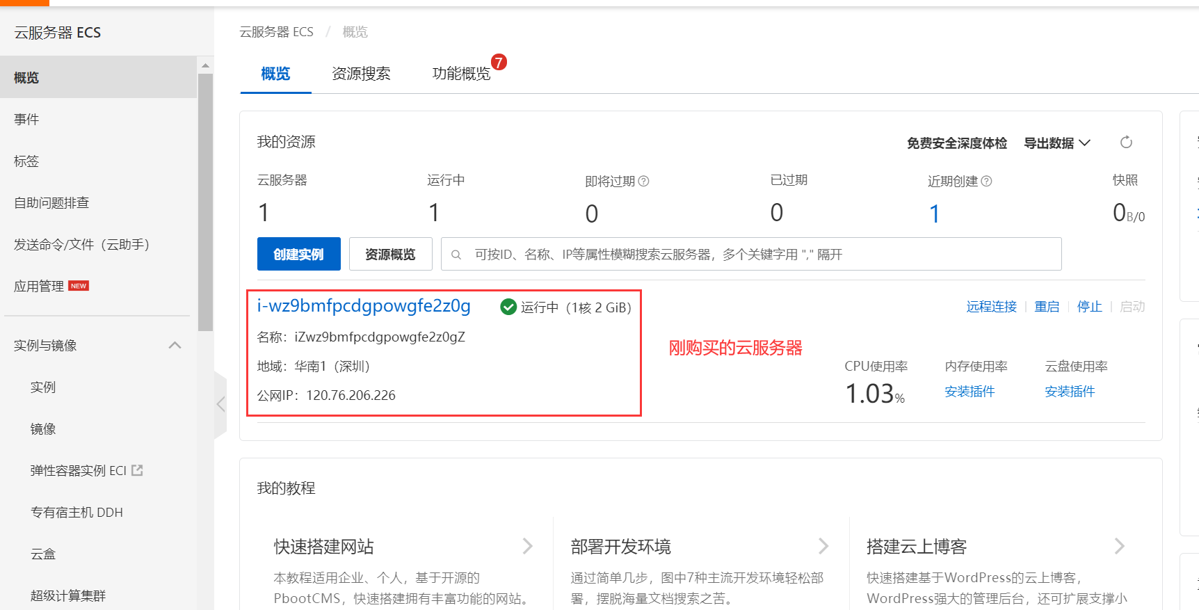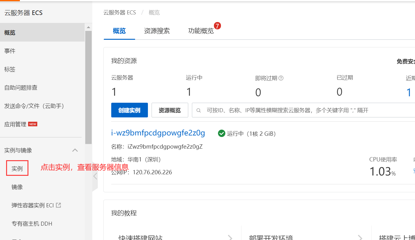 6、点击左侧实例与镜像下的实例,可以查看服务器的详细配置信息,也可以对服务器进行密码修改、重启等操作