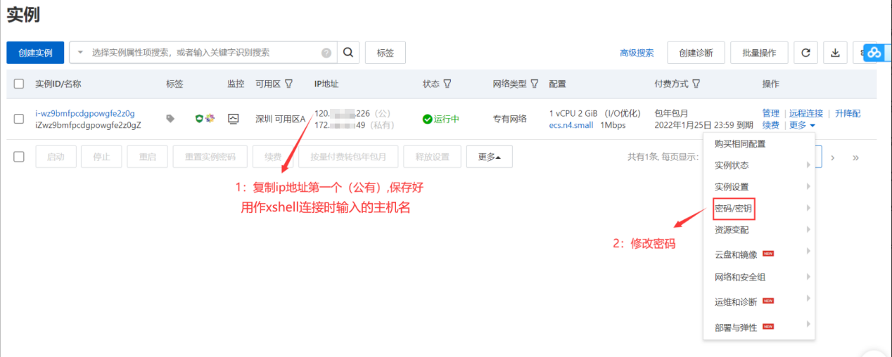 8、修改服务器密码:1)在操作下点击更多---密码/秘钥---重置实例密码。保存好重置界面的用户名root,以及重置的密码,用作xshell连接时输入用户名和密码。