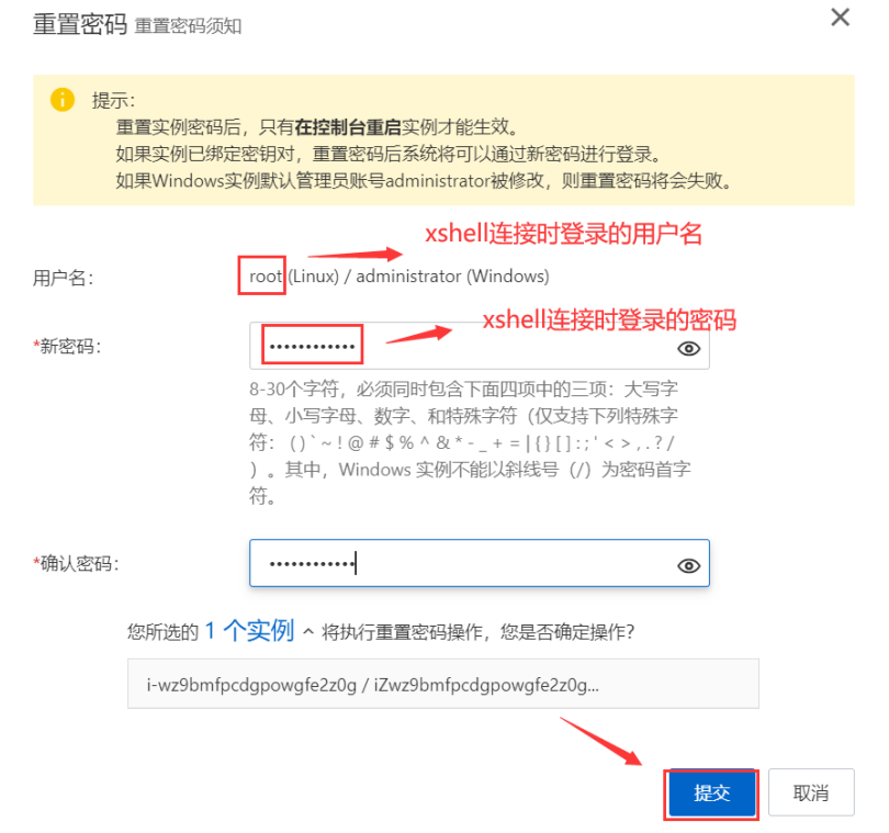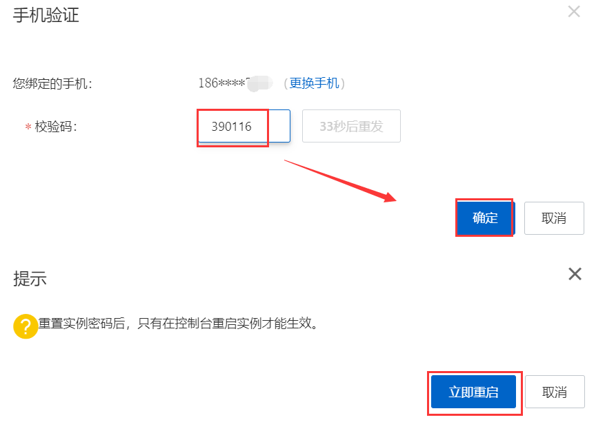 2)输入重置密码后,点击提交,要获取一个手机验证码。输入验证码,重置服务器密码成功后,提示重启服务器,点击立即重启。重启后,示例状态显示为运行中则表示重启成功。