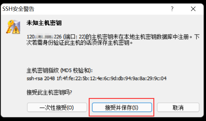 4)弹出的SSH安全警告,未知主机秘钥,点击接受并保存,就可以连接成功。通过xshell对云服务器进行相关操作了。