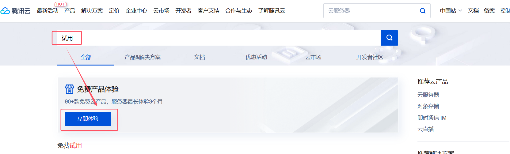 二、腾讯云服务器免费获取1、百度搜索腾讯云,点击腾讯云官网。进入官网,搜索“试用”,找到“免费产品体验”,点击“立即体验”。