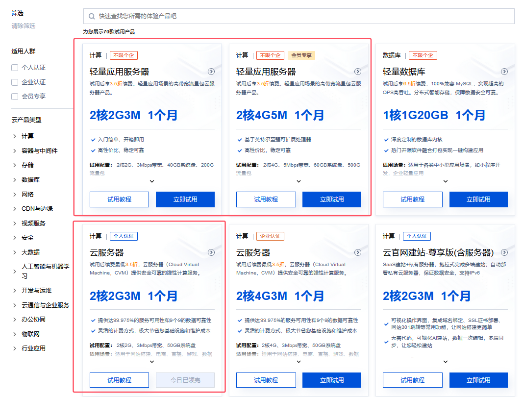 2、在免费试用专区,选择云服务器,依据自己的情况选择,个人使用-选择个人认证的,来进行试用。