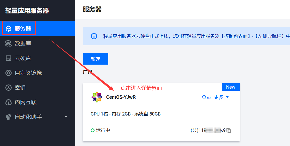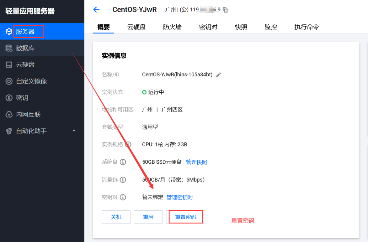 6、重新设置云服务器密码1)点击所属服务器进入详情页面--点击重置密码