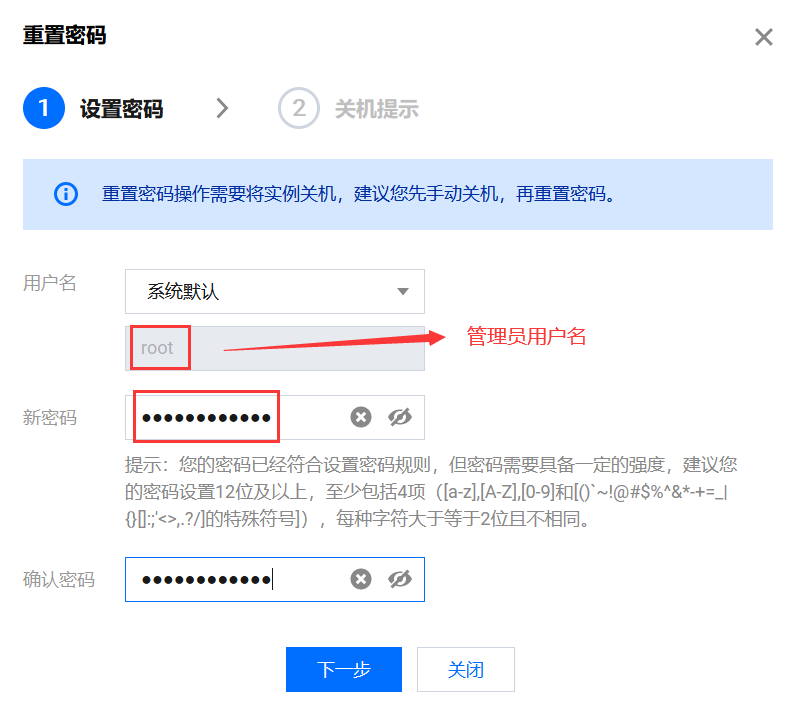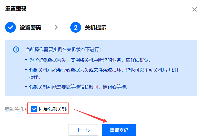 2)按照规则提示,输入新密码及确认密码。并同意强制关机,进行密码重置。