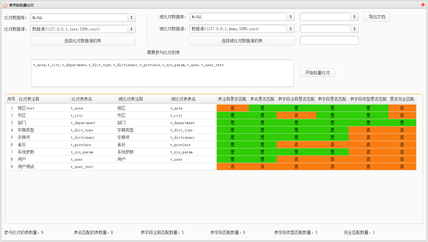 7、修改被比对数据源,输入需要参与比对的表,点击开始批量比对按钮开始比对。多张表用英文逗号分隔,如果不填则比对数据源中所有的表