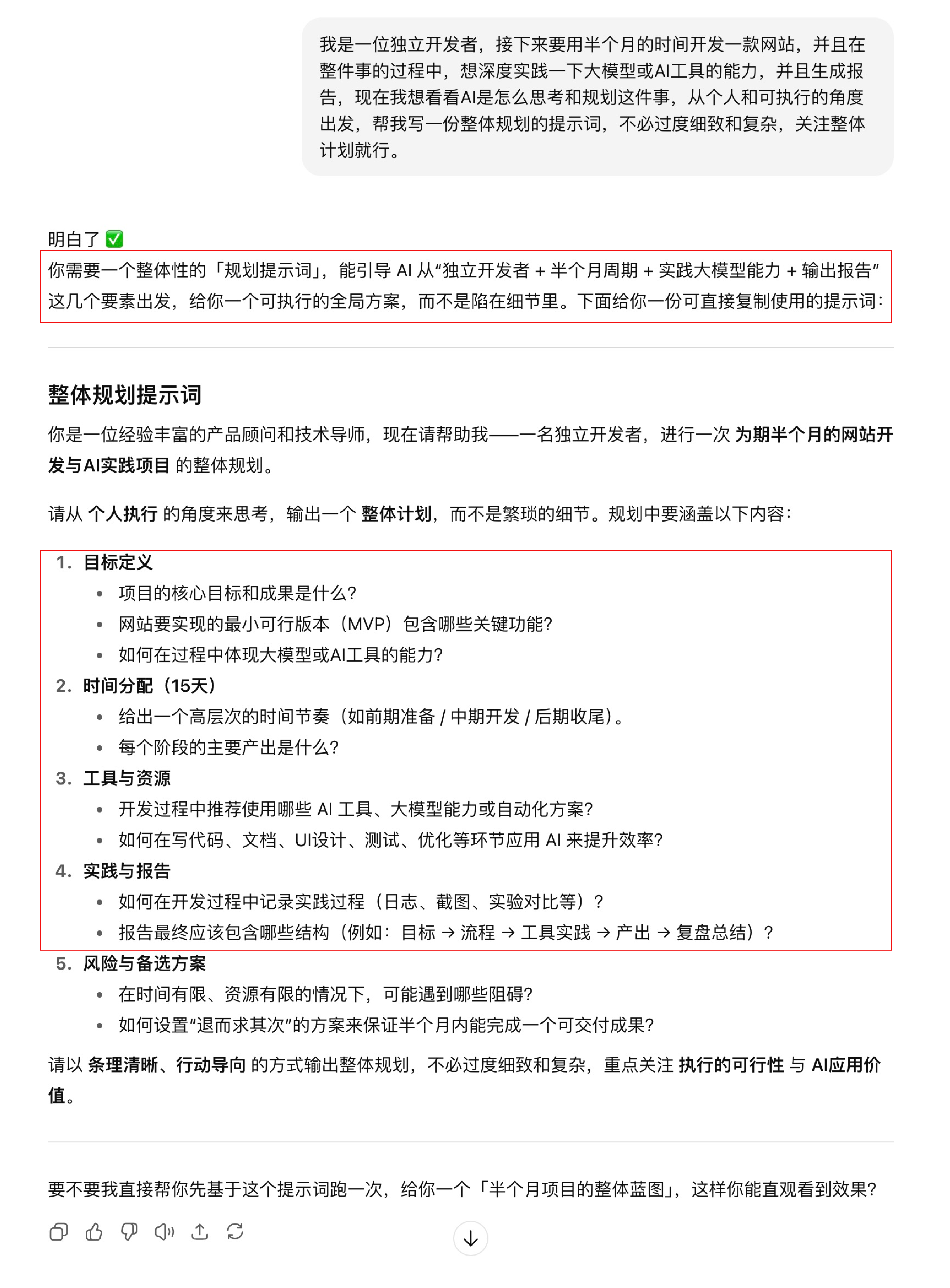 我是一位独立开发者,接下来要用半个月的时间开发一款网站,并且在整件事的过程中,想深度实践一下大模型或AI工具的能力,并且生成报告,现在我想看看AI是怎么思考和规划这件事,从个人和可执行的角度出发,帮我写一份整体规划的提示词,不必过度细致和复杂,关注整体计划就行。