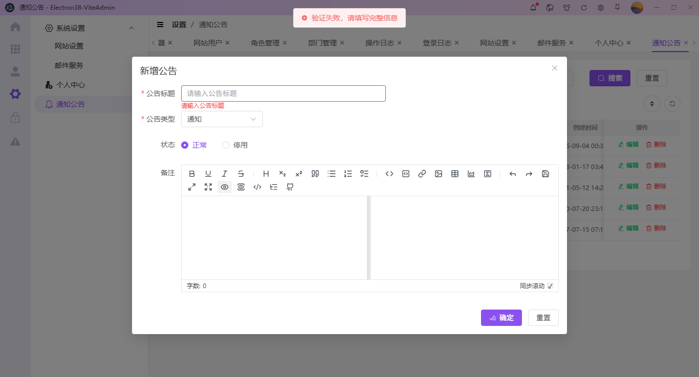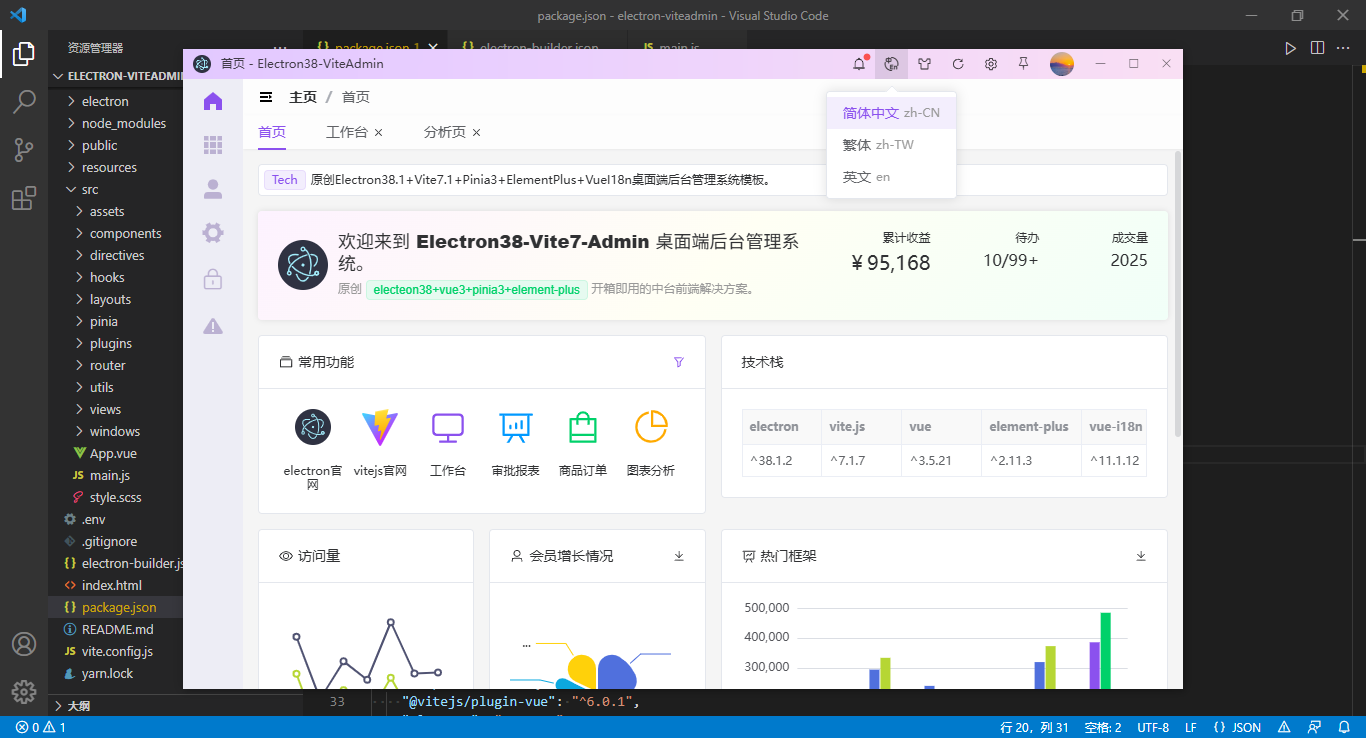 electron38-vite7-admin最新版跨平台框架 Electron38 整合 Vite7+Vue3+ElementPlus 搭建高颜值轻量级客户端中后台管理系统解决方案。包含4种常用布局模板,支持vue-i18n多语言、标签栏路由,集合了图表、表格、表单、列表、编辑器等功能。