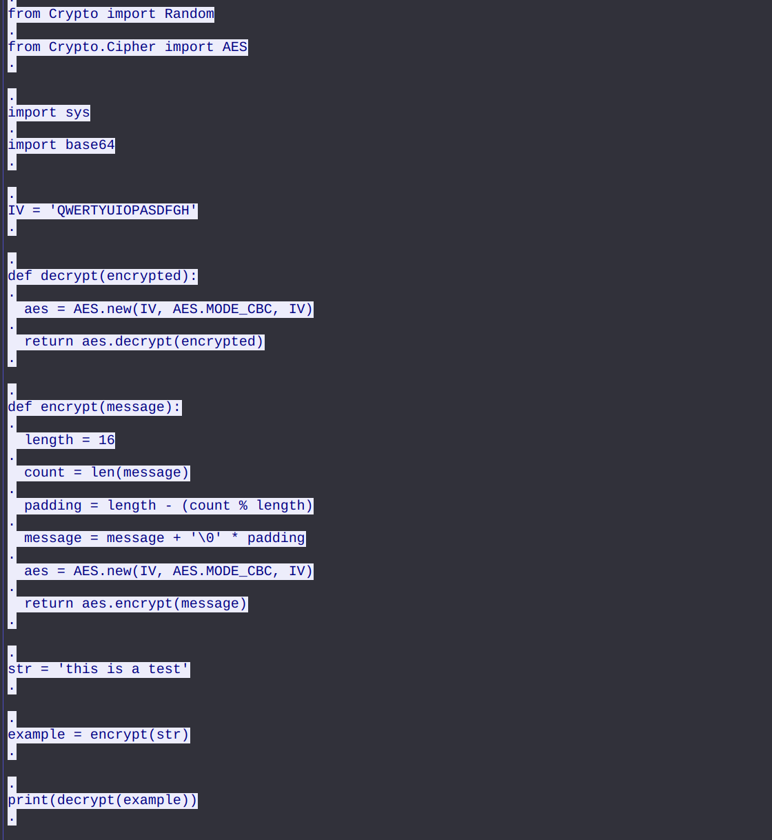 1. # Attempt to decrypt Base64-looking strings found in the Telnet capture# Using the AES parameters from the leaked Python script:# IV = 'QWERTYUIOPASDFGH' used as both key and IV, AES-CBC, null-byte padding.from Crypto.Cipher import AESimport base64key = b'QWERTYUIOPASDFGH'  # 16 bytesiv = keyb64_candidates = [    "19aaFYsQQKr+hVX6hl2smAUQ5a767TsULEUebWSajEo="]def try_decrypt(b64):    try:        data = base64.b64decode(b64)    except Exception as e:        return f"Base64 decode error: {e}"    try:        cipher = AES.new(key, AES.MODE_CBC, iv)        dec = cipher.decrypt(data)        # strip trailing nulls        dec_stripped = dec.rstrip(b'\x00')        try:            return dec_stripped.decode('utf-8', errors='replace'), dec, dec_stripped        except:            return ("", dec, dec_stripped)    except Exception as e:        return f"AES decrypt error: {e}"results = {}for b in b64_candidates:    results[b] = try_decrypt(b)results{'19aaFYsQQKr+hVX6hl2smAUQ5a767TsULEUebWSajEo=': ('passwd={No_One_Can_Decrypt_Me}', b'passwd={No_One_Can_Decrypt_Me}\x00\x00', b'passwd={No_One_Can_Decrypt_Me}')}