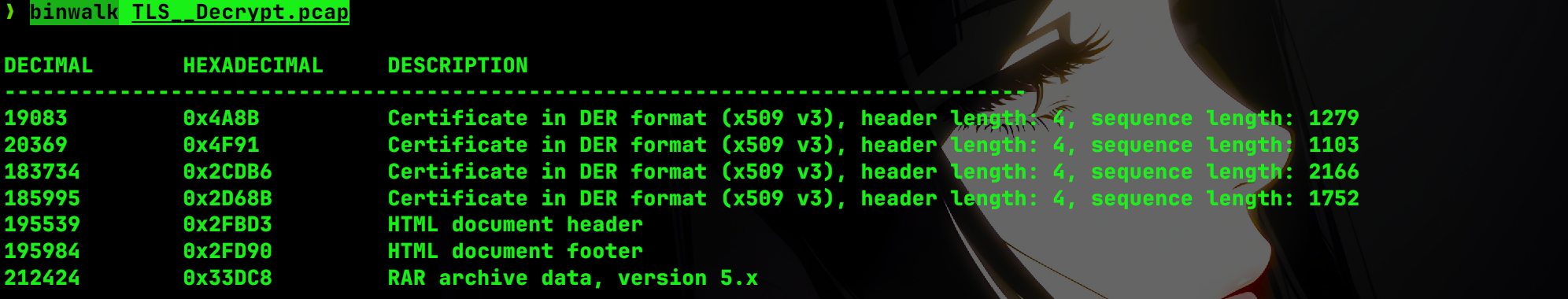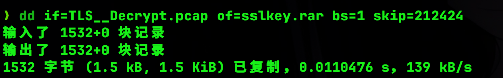 根据分析流量包,确认这个是sslkey.rar,根据binwalk的分析结果,我们确定了sslkey.rar文件在TLS__Decrypt.pcap文件中的起始偏移量为212424字节。现在,我们可以使用dd命令来精确地从PCAP文件中提取出这个RAR文件。