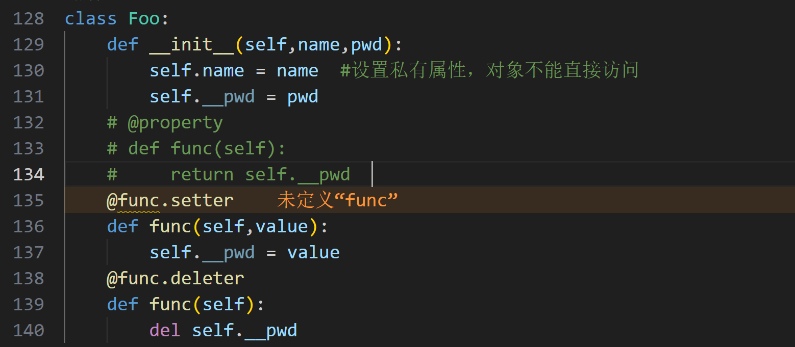 使用情况:删除私有属性- #删除私有属性class Foo: def __init__(self,name,pwd): self.name = name #设置私有属性,对象不能直接访问 self.__pwd = pwd @property def func(self): return self.__pwd @func.setter def func(self,value): self.__pwd = value @func.deleter def func(self): del self.__pwdobj = Foo('guohan','123')obj.func = 888print(obj.name) #>>>guohanprint(obj.func) #>>>888print(obj.__dict__) #>>>{'name': 'guohan', '_Foo__pwd': 888}del obj.funcprint(obj.__dict__) #>>>{'name': 'guohan'}