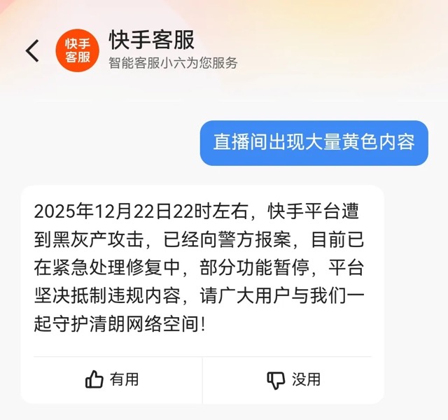 快手官方当时给出了紧急回应:2025 年 12 月 22 日 22 时左右,平台遭到黑灰产攻击,已经向警方报案,目前正在紧急处理修复中。