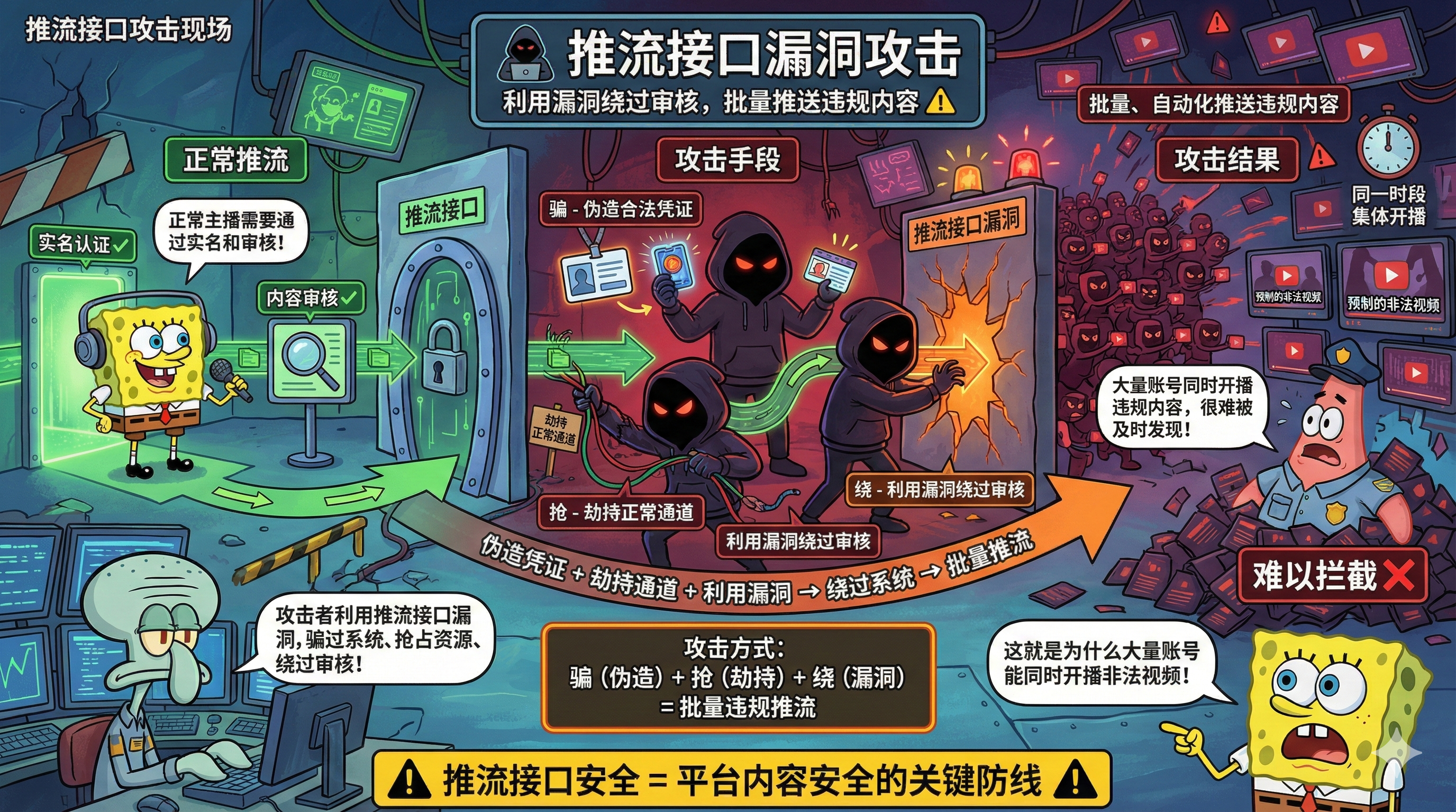 还有第 3 种可能,黑灰产利用了 直播推流接口 的底层漏洞。