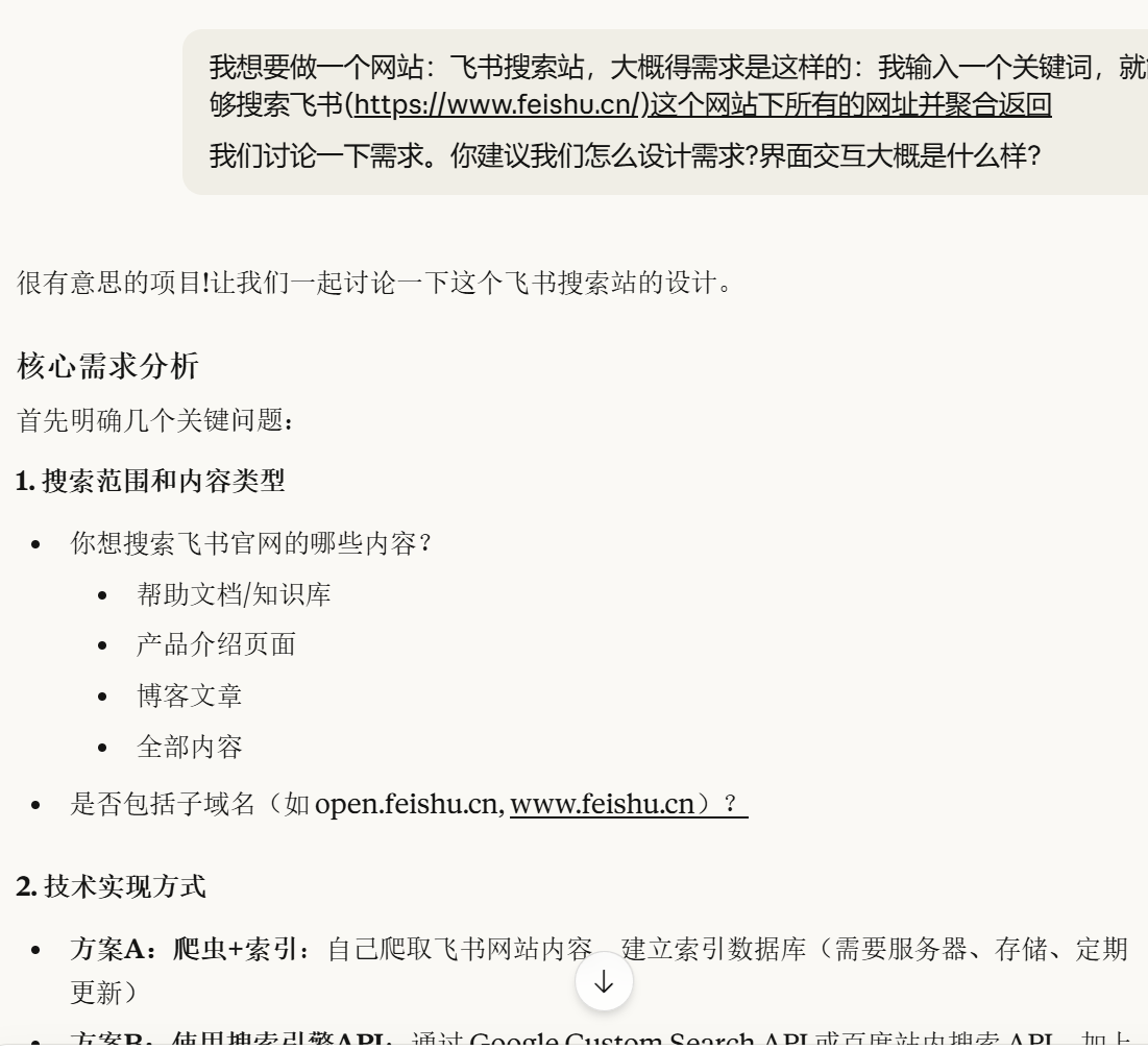 我想要做一个网站:飞书搜索站,大概得需求是这样的:我输入一个关键词,就能够搜索飞书(https://www.feishu.cn/)这个网站下所有的网址并聚合返回
