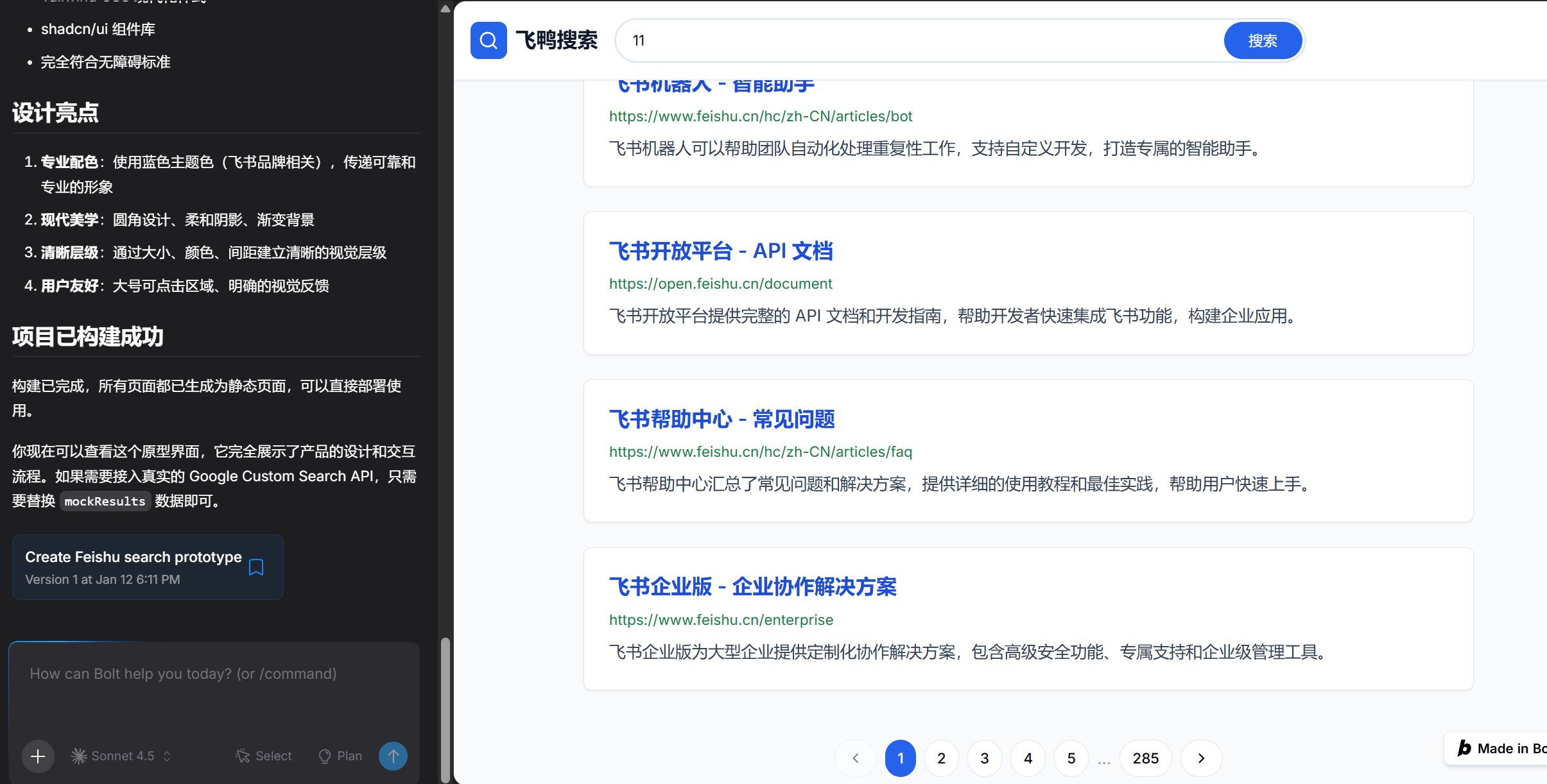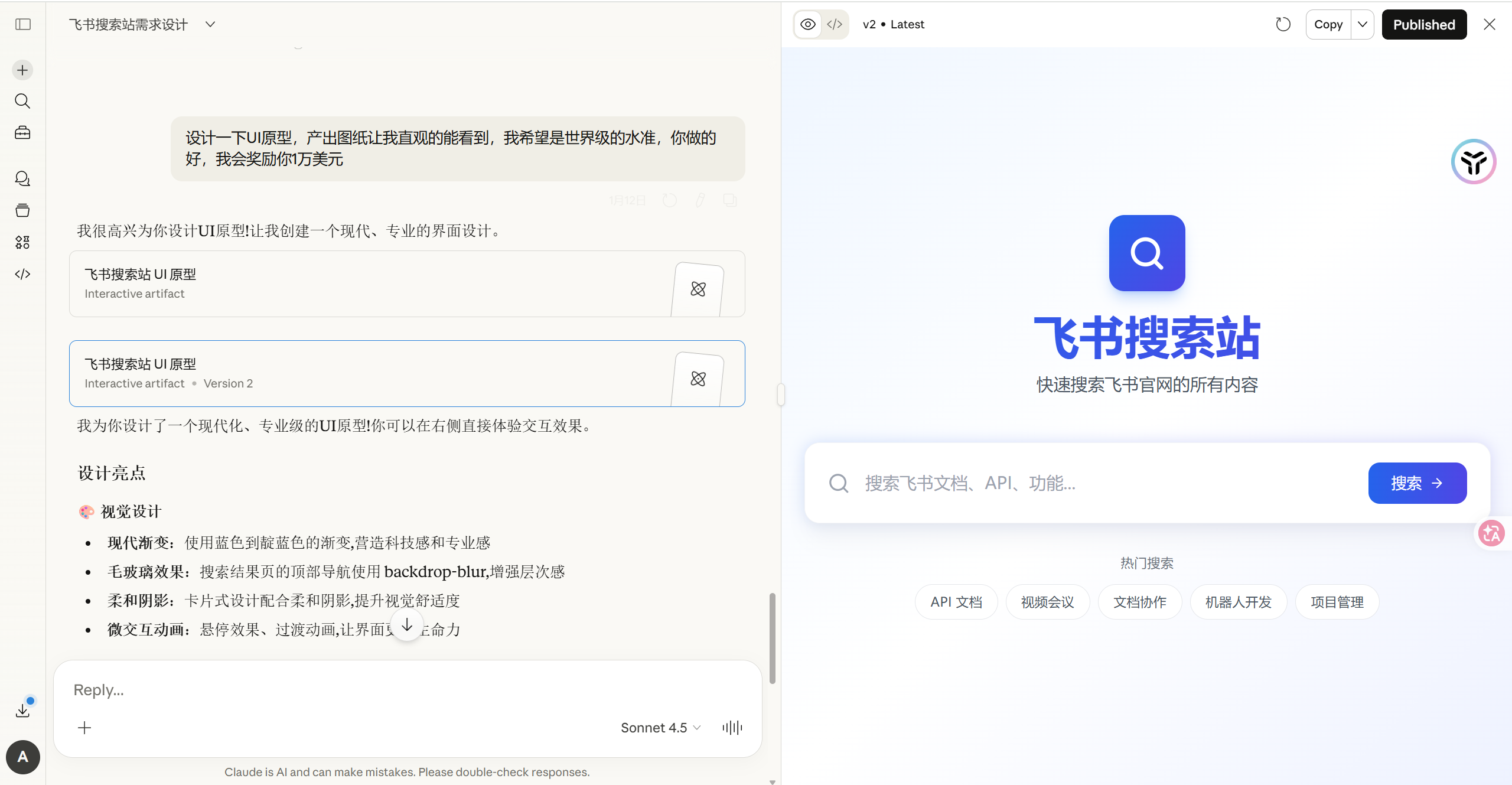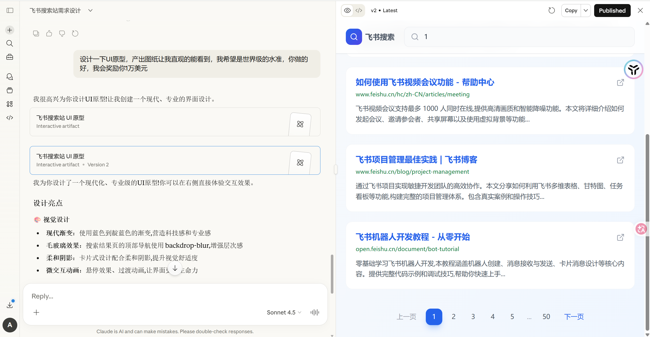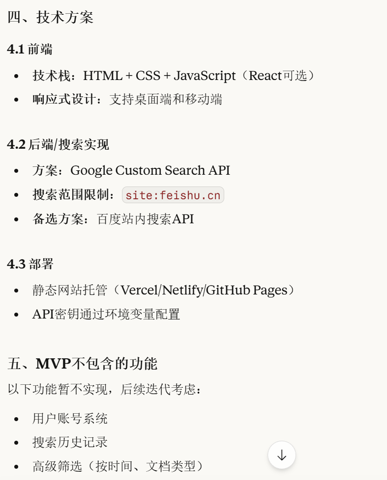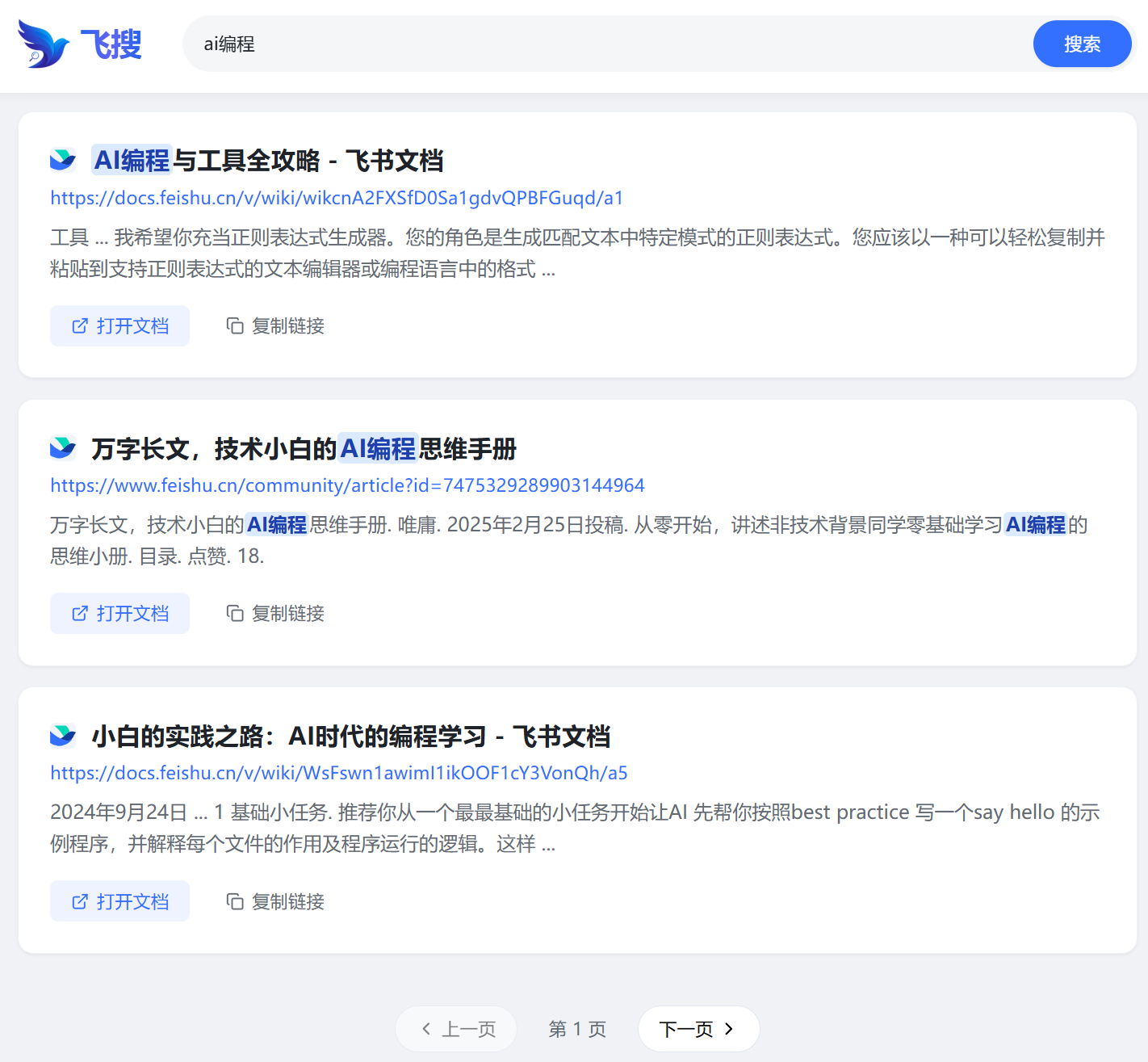 ,从0开发快速上线了一个飞书搜索的网站,界面效果如下,不得不说,AI是真的很强大!目前网站已上线,示例网址如下: