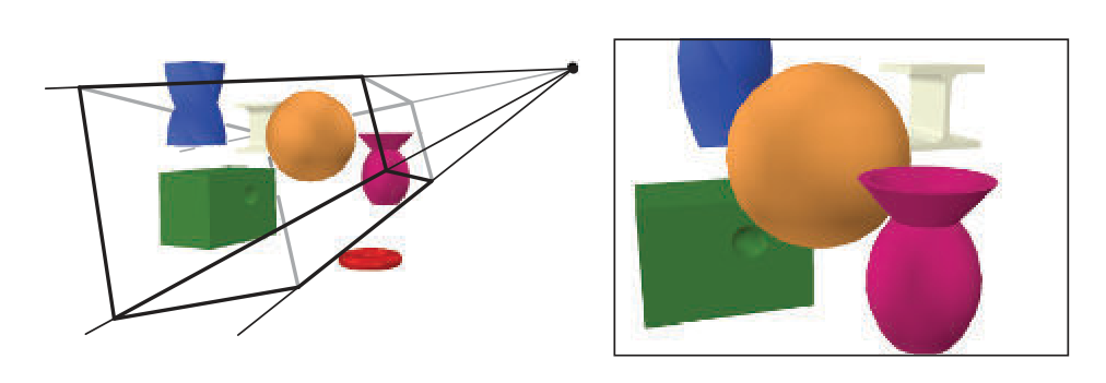 对于透视视图,我们假设应用程序已经提供了一个投影矩阵。此外,对于每个物体,假设应用程序已经计算出了一个矩阵描述物体的位置和朝向以及它的视图变换。在我们的例子中,华夫饼机的底座会有一个矩阵,盖子会有另一个矩阵。在几何阶段,物体的顶点和法线会使用这个矩阵变换到视图空间。接着在顶点的着色或其它的计算可能会进行。然后另一个单独的投影矩阵会被用来进行投影,把物体变换到单位立方体空间。所有可见的物体都会在这个空间中,那些在立方体外的图元都会被抛弃,而那些与单位立方体相交的图元都会被立方体裁剪。顶点接着被映射到屏幕上的窗口。在所有的逐三角形和逐顶点操作被执行后,结果数据会被传递到光栅化阶段。