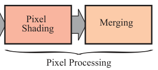 到这里,所有被认为在三角形或其它图元的像素都被到找了。像素处理阶段被划分为像素着色(Pixel Shading)和合并(Merging),这两个阶段如下图所示。