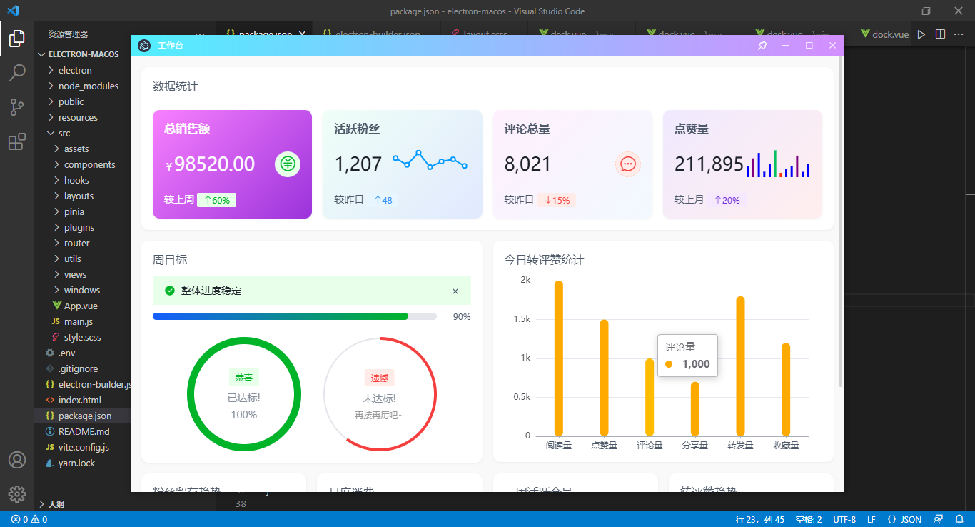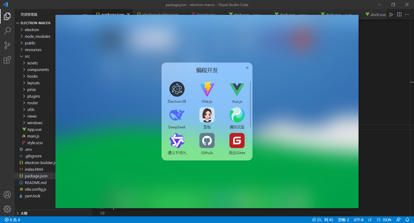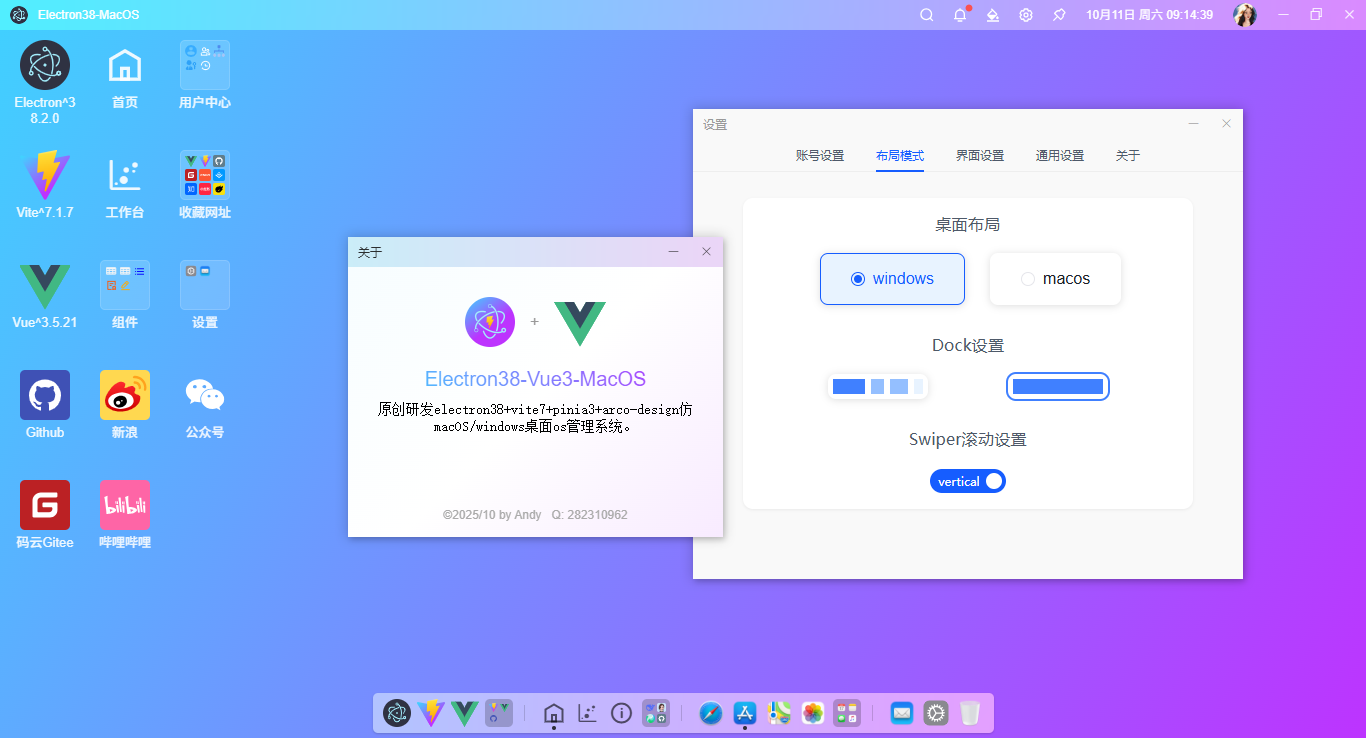 vite7-electron38-os最新款vite7.1+electron38.2+vue3 setup+pinia3+arcoDesign+echarts实战仿macOS/windows风格桌面os管理系统Exe模板。自研可拖拽栅格布局结构、自定义JSON配置桌面菜单/Dock菜单。