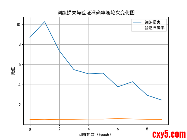 - plt.title("训练损失与验证准确率随轮次变化图")