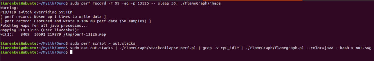2. sudo perf record -F 99 -ag -p 进程ID -- sleep 30; ./FlameGraph/jmaps